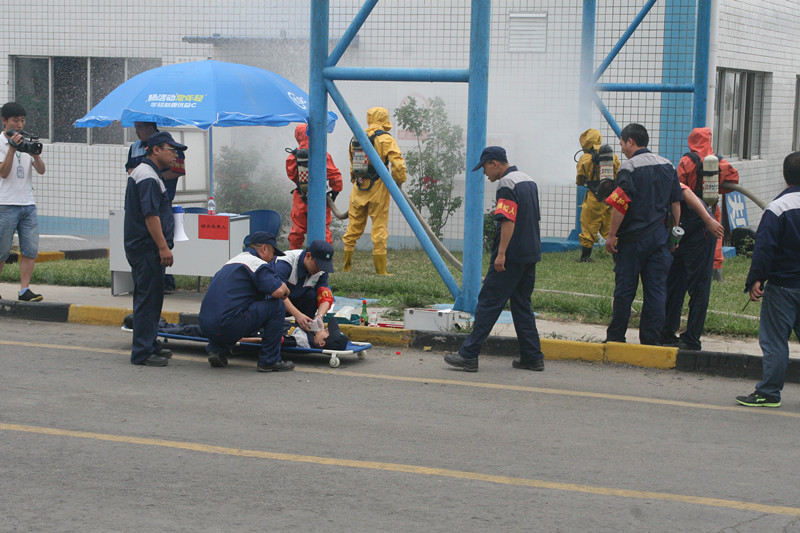 演練共設5個科目,分別為“安全警戒與疏散”、“液氨泄漏水幕隔離、稀釋”、“液氨泄漏堵漏”、“液氨中毒醫療救護”、“液氨泄漏環境監測”。演練中,治安救護隊對廠區戒嚴,進行道路管制,疏散職工;120急救醫生對中毒人員實施搶救,救援人員穿戴防化服、防毒面具,利用現場消防水炮進行液氨泄漏水幕隔離、稀釋,攜帶專用器材迅速奔赴現場進行液氨泄漏堵漏;公安消防大隊前來支援戰斗,環境保護人員對大氣、對外排水進行監測。經過30分鐘的努力“救援”,“險情”被妥善處理,演練取得成功。事故處理結束后,解除警戒,并立即成立事故調查組和設備搶修組,調查本次事故的原因,對事故發生設備進行檢查搶修。